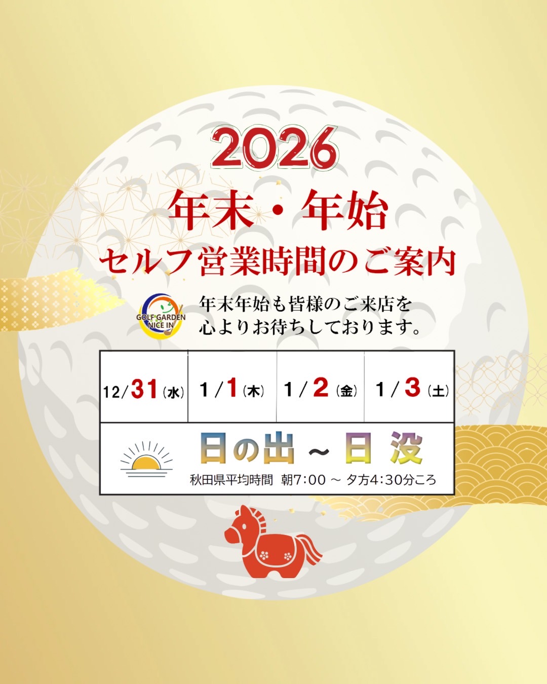 お知らせ 年末年始のご挨拶🙇♂️ クリック👆 Tweet 2025.12.30 by ナイスイン 0 今シーズンもナイスインをご愛顧いただき、誠にありがとうございます!🙇♂️ 来年も何卒よろしくお願い申し上げます! 年末年始(セルフ営業)も年中無休で営業しておりますので、球納めや初打ちにご利用下さい⛳🏌️♂️🏌️♀️🎍 ゴルフガーデンナイスイン 住所:〒015-0031 秋田県由利本荘市浜三川字西大台101-34 電話:0184-24-3339 営業時間:日の出〜21:00 (日の出〜午前9:00まではセルフ営業) ※毎週月曜日(祝祭日の場合は翌日)は集球作業のため、午前10:00からの営業となります。 ※冬期間(12月〜2月)営業時間:日の出〜18:30